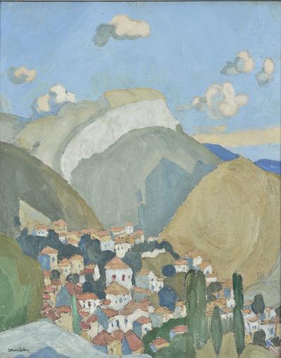 Blu di celeste dolcezza, le montagne alte si appaiano come sculture, chiudendo l' orizzonte, mentre ai piedi ci sono case geometriche, case di colore delle persone. I cipressi si vedono verticalmente, le nuvole orizzontali e curvilinee, una pittura di semplicità dove il colore traduce volumi e ritmi, la sintesi della vita, un piccolo villaggio di Mytilini, un campo di semplicità e di continuo esercizio all'occhio dell'artista. La realtà, un campo di piacere che diventa la miccia dell’ atto della pittura.